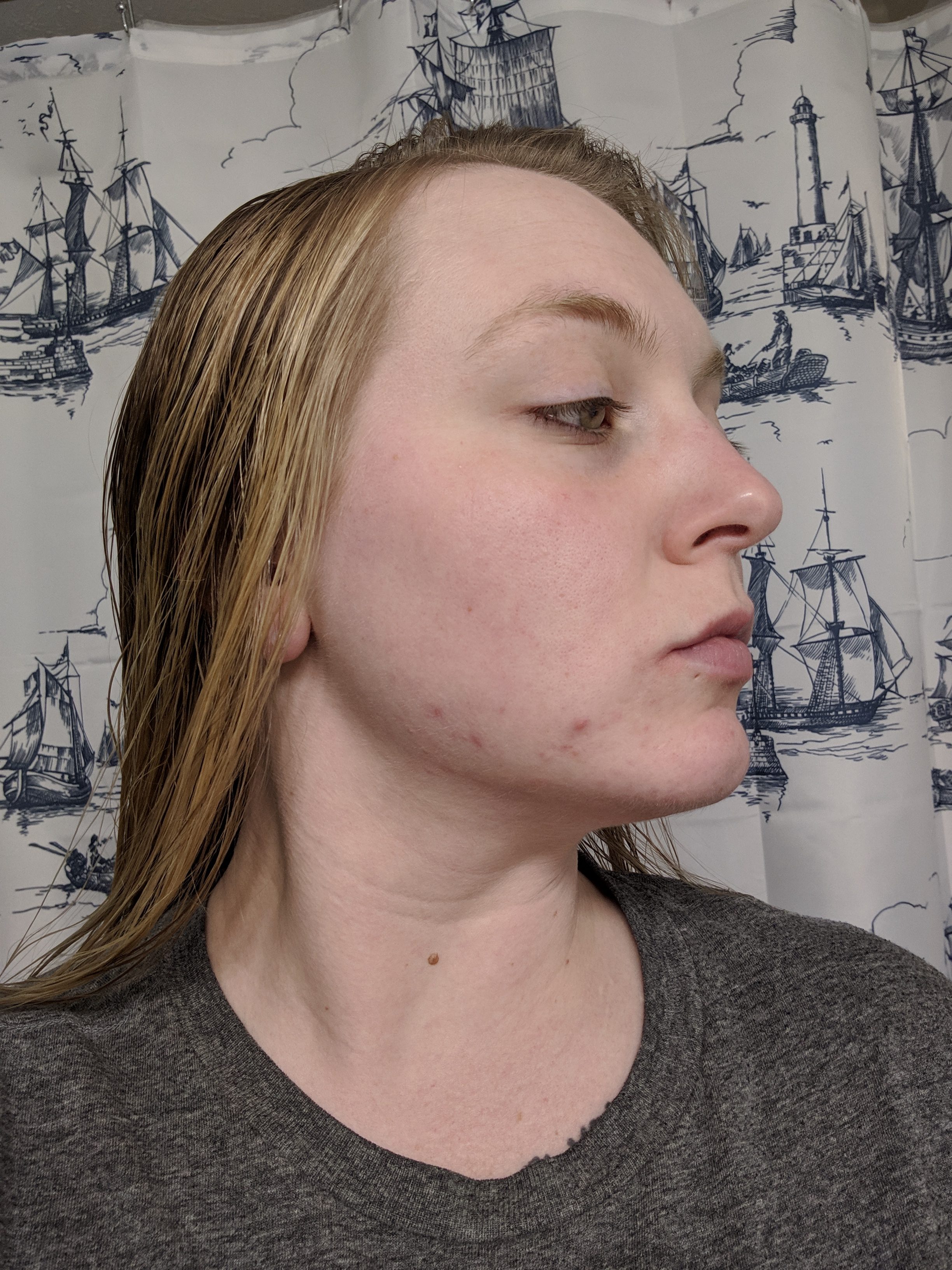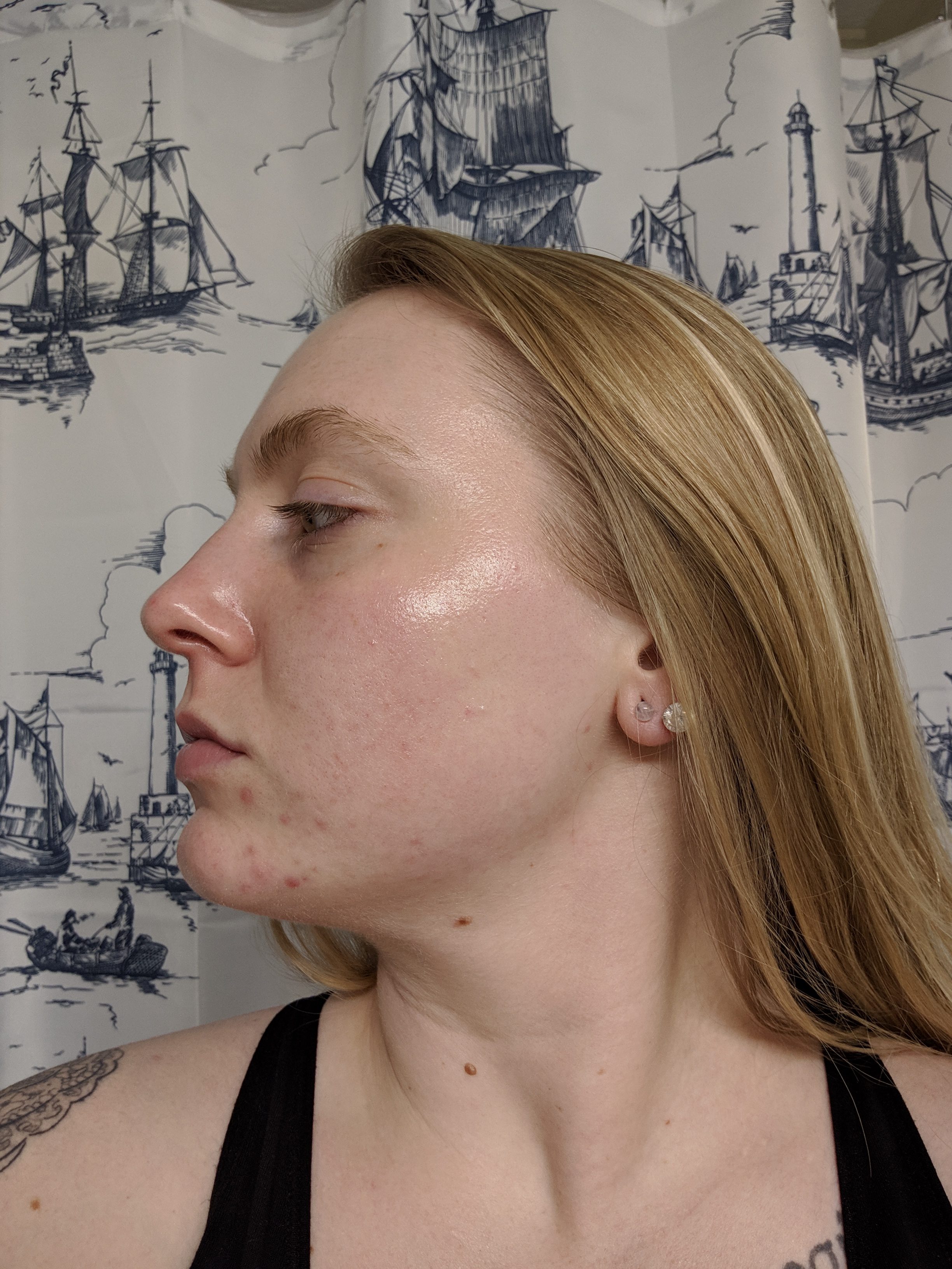 In this photo I totally forgot to take a photo before my skin care routine, so that is why my face is extra glowy. You can see in the right photo that I ended up getting some new break outs. I attribute this to being hormonal as it was around that time. It is probably good to note that the increased redness and the definition of my acne scars is due to rubbing on all my skin care.